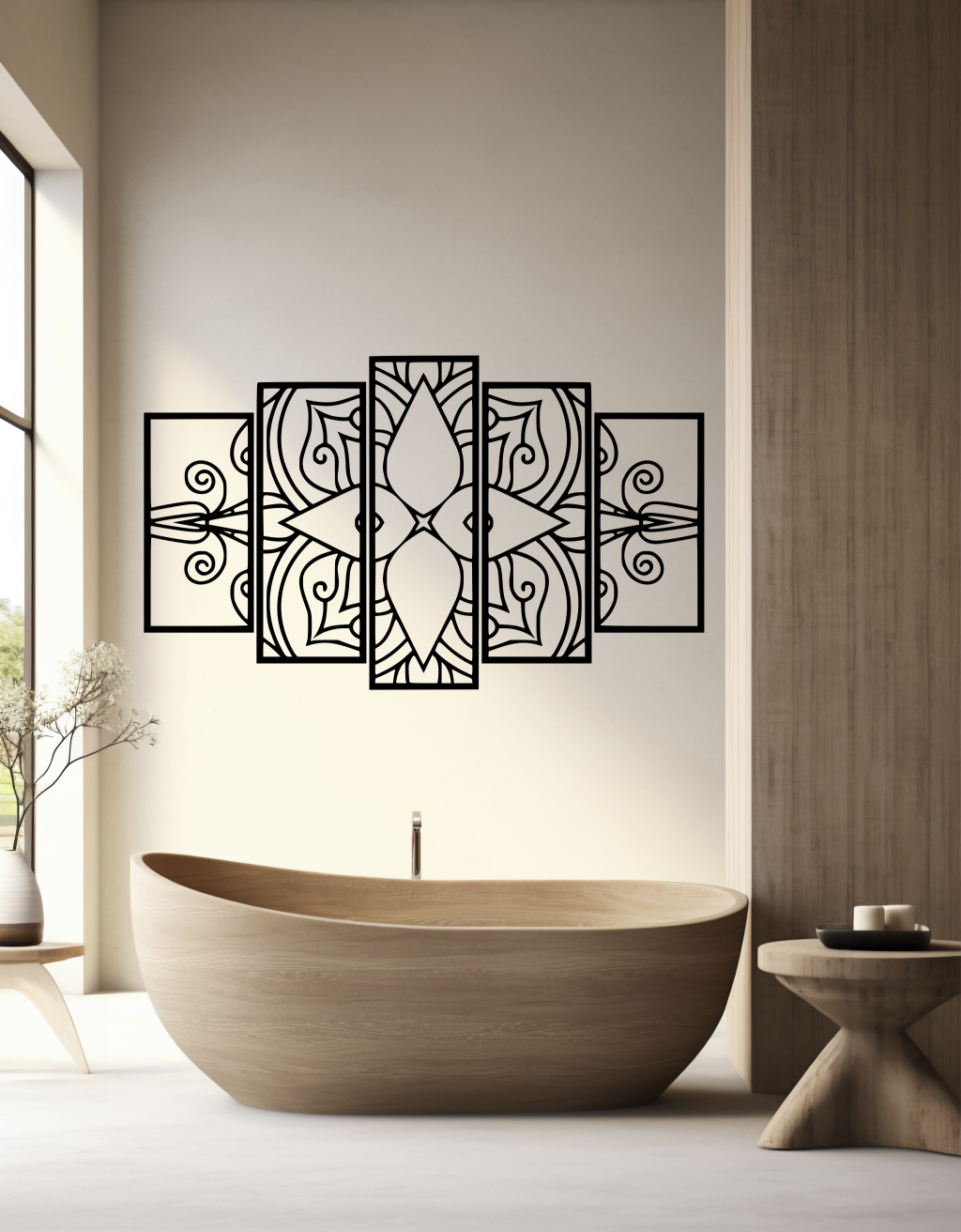 This 5-piece set is meticulously crafted to evoke a sense of balance and tranquility, making it a perfect addition to both modern and traditional interiors. Each of the five panels is 280mm in width, ensuring a consistent and unified appearance when arranged together. The tallest center piece, standing at an impressive 850mm, serves as the focal point, drawing the eye and anchoring the entire composition. Flanking this central piece are four additional panels, each echoing the intricate patterns and flowing lines of the Mandala design.